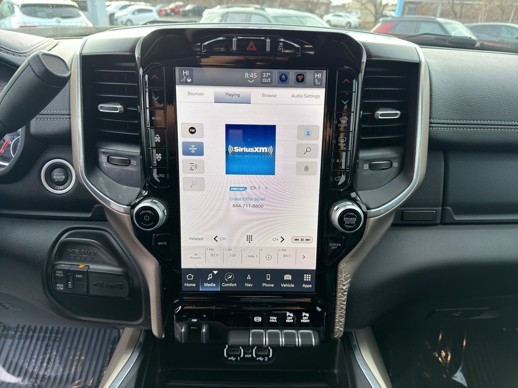 Laramie Level 1 Equipment Group: Google Android Auto; SiriusXM Radio Service; Blind Spot and Cross Path Detection; Power Adjustable Pedals with Memory; For Details. Visit DriveUconnect.com; For More Info. Call 800-643-2112; Integrated Voice Command with Bluetooth®; 12" Touchscreen Display; Auto Power-Folding Mirrors; Front LED Fog Lamps; Mirror Running Lights; Alexa Built-In; Apple CarPlay; Power Adjustable Convex Aux Mirrors; Forward and Reverse Utility Lights; Disassociated Touchscreen Display; Remote Tailgate Release; 2nd Row in Floor Storage Bins; Rear Window Defroster; Rain Sensitive Windshield Wipers; Rear Power Sliding Window; Connectivity - US/Canada; GPS Navigation; 4G LTE Wi-Fi Hot Spot; GPS Antenna Input; Exterior Mirrors with Heating Element; Auto Dim Exterior Mirror; SiriusXM with 360L; Global Telematics Box Module; Connected Travel and Traffic Services; LED Reflector Headlamps; Foam Bottle Insert (door Trim Panel); Off-Road Information Pages; Selectable Tire Fill Alert; Trailer Tow Pages; HD Radio; Uconnect 5 Navigation with 12.0" Display Radio; Power Heated Fold Telescopic Mirrors with Memory; Exterior Mirrors with Supplemental Signals; Exterior Mirrors Courtesy Lamps; Auto High Beam Headlamp Control; Chrome Exterior Mirrors; Exterior Mirrors with Memory; Power Adjust Mirrors; Power Telescoping Mirrors; Radio/driver Seat/mirrors/pedals Memory; Auto Dim Exterior Passenger Mirror; Auto Adjust in Reverse Exterior Mirrors; ParkSense Front/rear Park Assist System. Quick Order Package 2HH Laramie. Protection Group: Tow Hooks; Transfer Case Skid Plate Shield. 20" X 8.0" Polished Aluminum Wheels. RamBox Cargo Management System. Blind Spot and Cross Path Detection. Leather Trimmed Bucket Seats. Anti-Spin Differential Rear Axle. Granite Crystal Met CC. MOPAR Front and Rear Rubber Floor Mats. Tow Hooks. Clearance Lamps. **Equipment listed is based on original vehicle build and subject to change. Please confirm the accuracy of the included equipment by calling the dealer prior to purchase.**